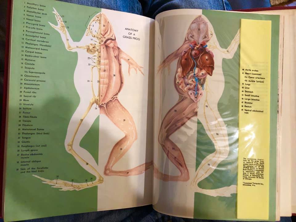 The pages with overlays fascinated me. I remember pulling F off the shelf and thumbing through until I found Frog. There it was. Splayed out on page 466 is the base of Anatomy Of A Grass Frog, beginning with the maxillary bone ending with the skin of the forelimbs and hind limbs. The following two pages were printed on clear “Transvision” sheets that contained all the frog’s innards. The aortic arches, spleen, and renal arteries. All the good stuff you can’t see from the outside of a frog.