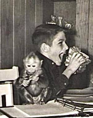 The picture of Pete and me was staged by my oldest brother who was the photographer for our school yearbook. It was taken at our kitchen table to depict a kid doing his homework while eating and listening to the radio. Of course the monkey was there to help me study. (In reality the monkey may have been a better student than I was.)