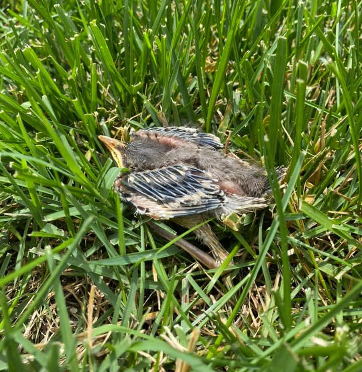 Since my back surgery I am no longer allowed to ride a mower, so I push the half acre lot. I don’t mind. I take my time and I consider it my personal gym. The ground beneath the grass was still wet from all the rain. My feet were soaked. The grass was a little higher than normal and I found a baby Mockingbird trying to hide. I’d been out there sloshing through it for just over an hour when I noticed I was not alone.