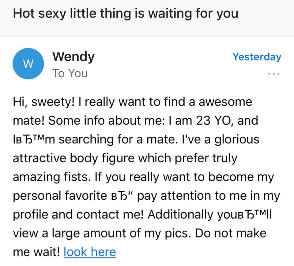 Especially Wendy. I don’t know who Wendy is and I’m pretty sure that she sent this birthday greeting to me by mistake. Wendy, if you’re reading this, thank you for the offer, but I am perfectly satisfied with the wife I have. She may not be 23, but she once was. And I remember those years. She may not pose for sexy pictures, but she’s secure enough that she doesn’t need to. We’ve grown old together. I’m afraid that you and I could never do that. But I do hope you find the sugar-daddy you seem to be looking for. I apologize for not clicking on your link and looking at your pictures. My daughters are older than you and I just wouldn’t feel comfortable doing that. I hope you understand.