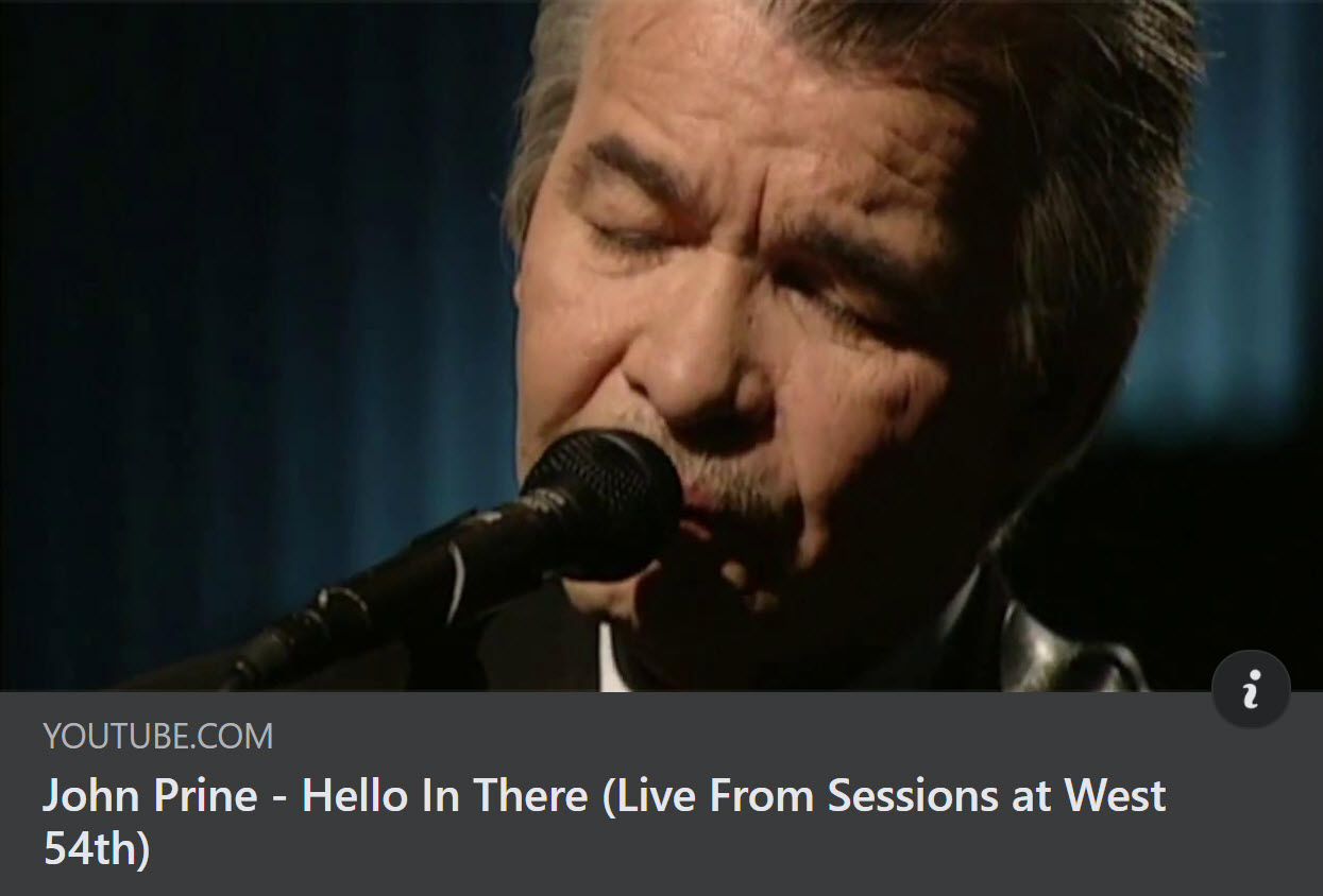 Attached is a link to John Prine’s song I mentioned. I hope you enjoy it. After listening to it you may want to pay someone a visit and say, "Hello in there”.