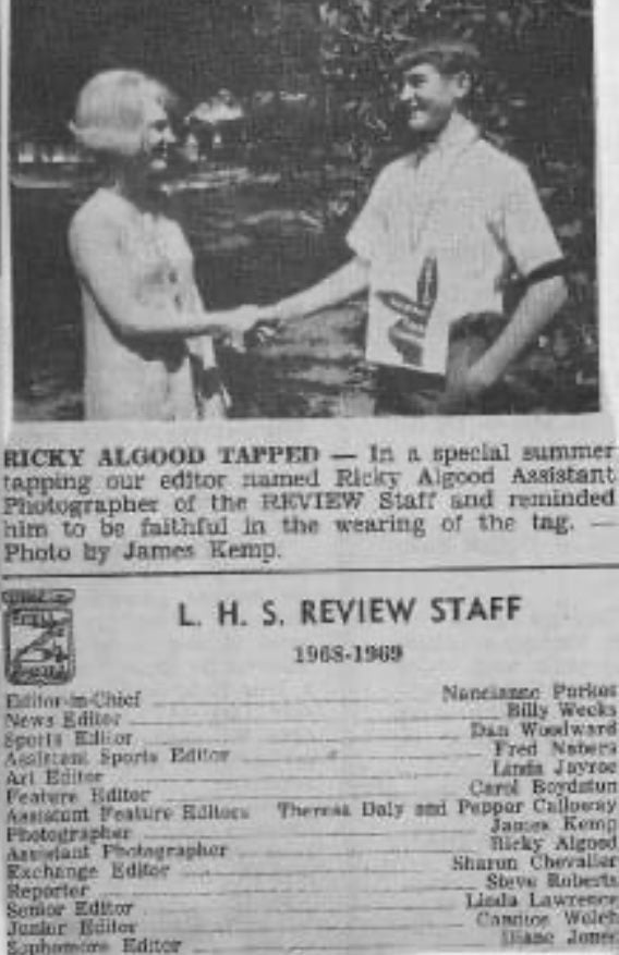 It didn’t take long before I realized having a driver’s license was going to open up a whole new world for me. The first solo trips were like adventures, even though I had traveled those roads before with my father. Mother had never learned to drive so I became her new chauffeur. To get into town I had to drive through Dead Man’s curve which was just outside the city limits. In its day it was known as one of the most dangerous curves on Old Robinson Road, and a lot of people hadn’t slowed from sixty-five-miles-an-hour to thirty in time to make the bend in the road. Many had had been injured and several had died in that curve. Among those that had had wrecks was my cousin, Al, who had failed to slow down, missed the curve and zipped off the road into the nearby pecan orchard. Luckily, squeezing between two pecan trees had slowed him down enough that when he crashed, head-on into another one, he was able to survive. Both sides of his car were nearly ripped off, plus the front of his car had been shoved backwards nearly a foot. He was able to climb out a little worse for the wear. After that and tumbling out the window onto the fire escape at school he should have considered a career as a stuntman, yet he went on to become a pharmacist. Also located in that curve was our county Poor House. That was where elderly people and the infirm went to live when they had no family to take care of them. Taxes from the county were set aside to take care of them and the property. There were a couple of long bunkhouses just off the highway on its grounds. A long porch ran along the front of each of the buildings and each room had a chair parked beside its front door for the residents. A barn was on the east side of the property and there was a small pasture for the mules that were used to till their garden. Willie was a a simple minded adult who lived there and he was in charge of the livestock and garden. Handling the mules was his special talent. He also took care of the milk cow and did the plowing. The people tended to the garden and firewood, if they were physically able. It mattered not who was passing by on the road out front, Willie would always stop what he was doing, carefully inspect each vehicle, give them a toothless grin and wave. It made his day when someone stopped by and talked to him. He was a very lonely soul. I can remember stopping by with my father when we had extra produce from our garden to share with them. They were always grateful and eager to talk to anyone. Every Christmas we made up a basket of fruit, cookies and candy to drop off to them. It was sad how little they had, but they were always appreciative. I remember seeing Willie stop, grin real big, and wave at me on my first solo trip into town. He felt like somebody and so did I. Navigating down Main Street during summer months was a bit of a challenge. It was plenty wide enough, but the center of the street was marked off for trucks that delivered merchandise to the stores and many times it was like driving through a farmer’s market with people from the country parked in the center of the street trying to sell their produce and wares. On Saturdays it wasn’t unusual to see a man that was a deaf-mute on the sidewalks that would draw your likeness for any spare change you would give him. Then there was another man who walked around and sold small bags of peanuts for a nickel or a dime. Of course, Johnny Hightower could be seen making his rounds as well. Our little town was special. We looked after each other. Soon after I had my driver’s license, I was asked to be a photographer for The LHS Review, our school newspaper. I began traveling to shoot most of the athletic events, band trips and other school functions. One week a reporter and I were assigned to cover an article about a haunted trailer-house in an adjoining county. It seemed like it took forever to find the place on rural back roads, but when we arrived the owner assured us her trailer was haunted. The ghost supposedly appeared in her foggy bathroom mirror on a daily basis. The reporter was writing it all down and taking it all in while I strained to see whatever it was that I was supposed to see in the bathroom mirror. Personally, I suspected the mirror needed a good cleaning, and I couldn’t find anything to take a picture of. Perhaps it was the ghost’s day off. But the lady described what the ghost looked like and I sketched out a picture of whoever it was. She said I had captured a perfect likeness and that was the picture that appeared in the next edition of our school paper.