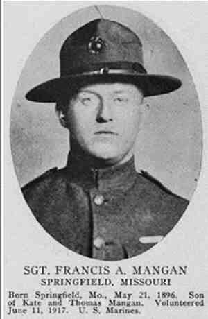 30. Francis A. Mangan (Thomas Mangan14, Mary Jane Brazeal3, Henry Willis1) was born on 21 May 1896, died on 24 Jun 1955 at age 59, and was buried in Greenlawn Memorial Gardens, Greene, Missouri, United States.